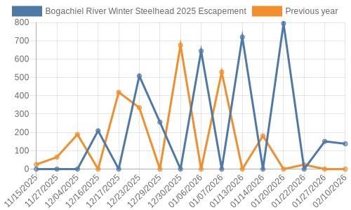 The smolt plants in 2024 are up slightly, which means if the survival rates of smolt->adults were similar, we should be expecting a greater number of 3-year-old adult steelhead returning to the Bogachiel in 2025-2026.