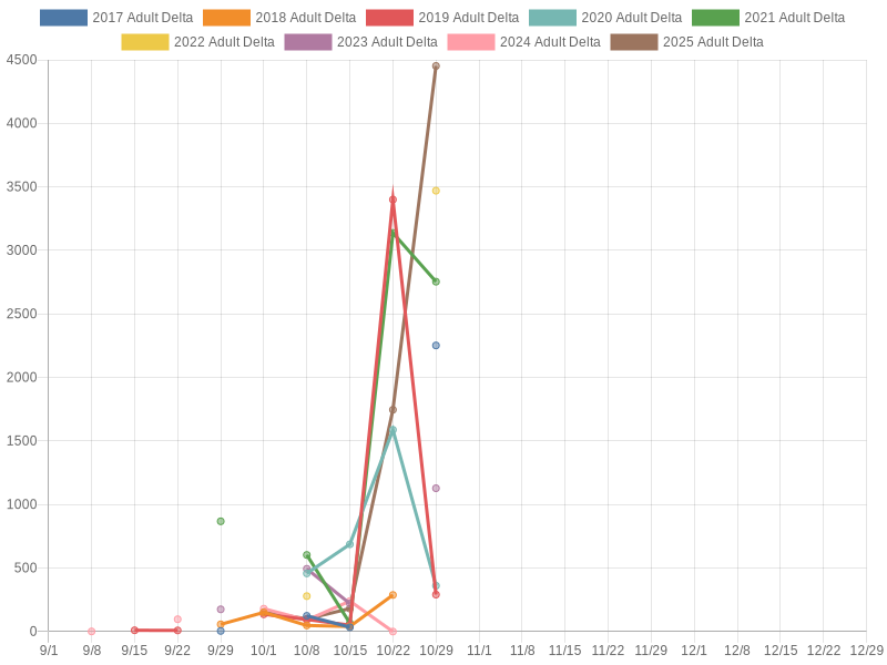 What you see reflected in this chart is largely return timing dominated by surges of water due to rainfall. Like many fall coho fisheries, you can fish the early part of the run for steady salmon fishing or time the high water even to catch the back end of a large push of coho salmon charging up the river.