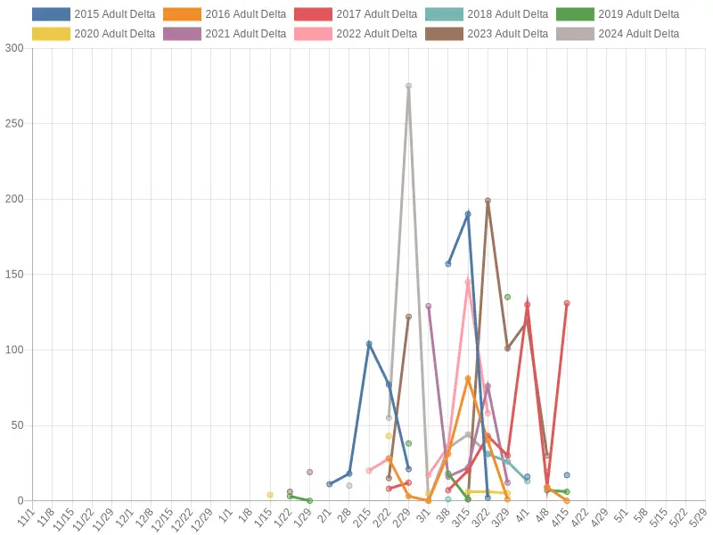 Once Steelhead start returning to the hatchery and get reported by WDFW, this graph will automatically update, typically on Thursdays.